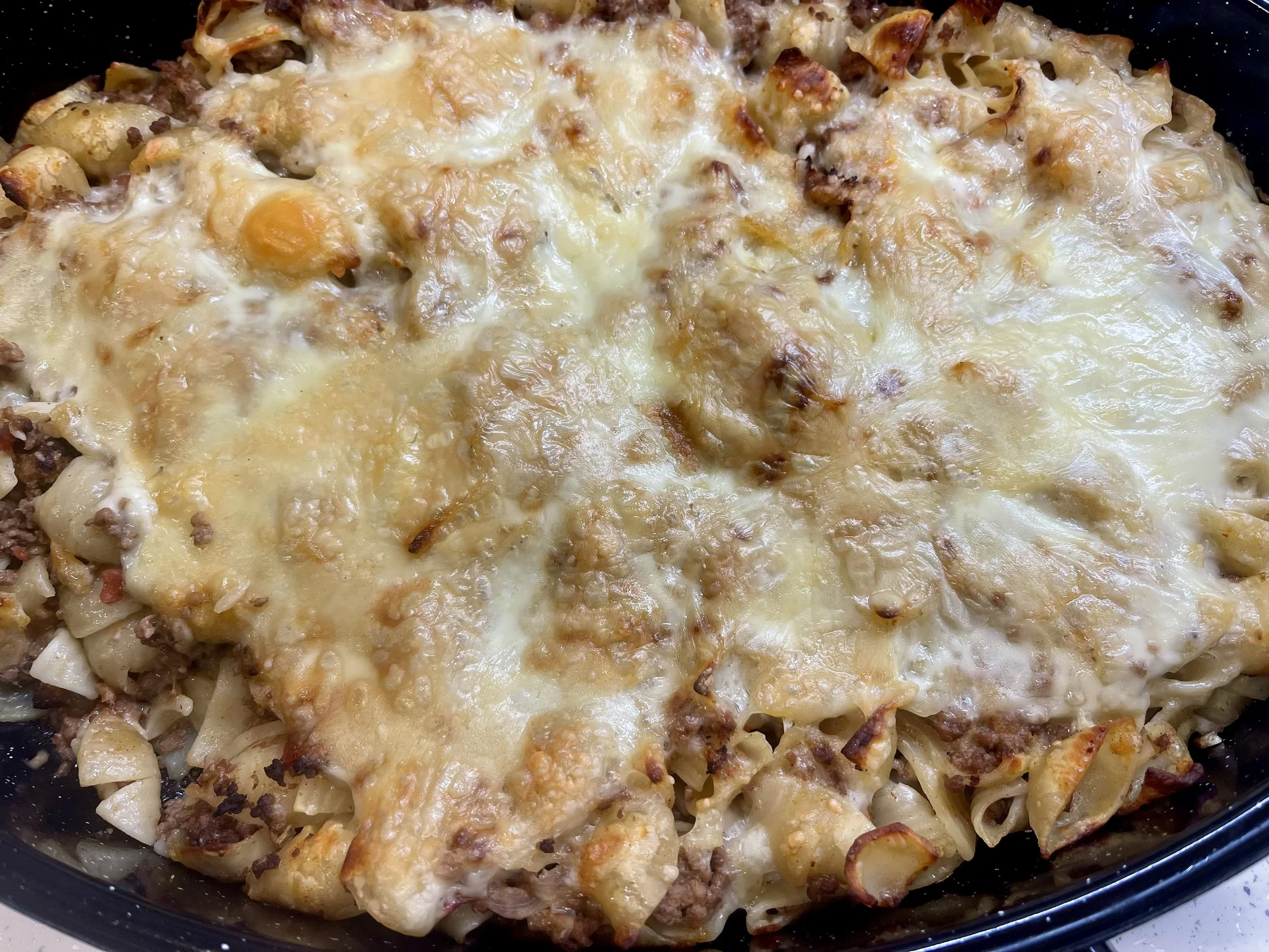 Ανακατεύεις :μακαρόνια + κιμά + τριμμένο τυρί.